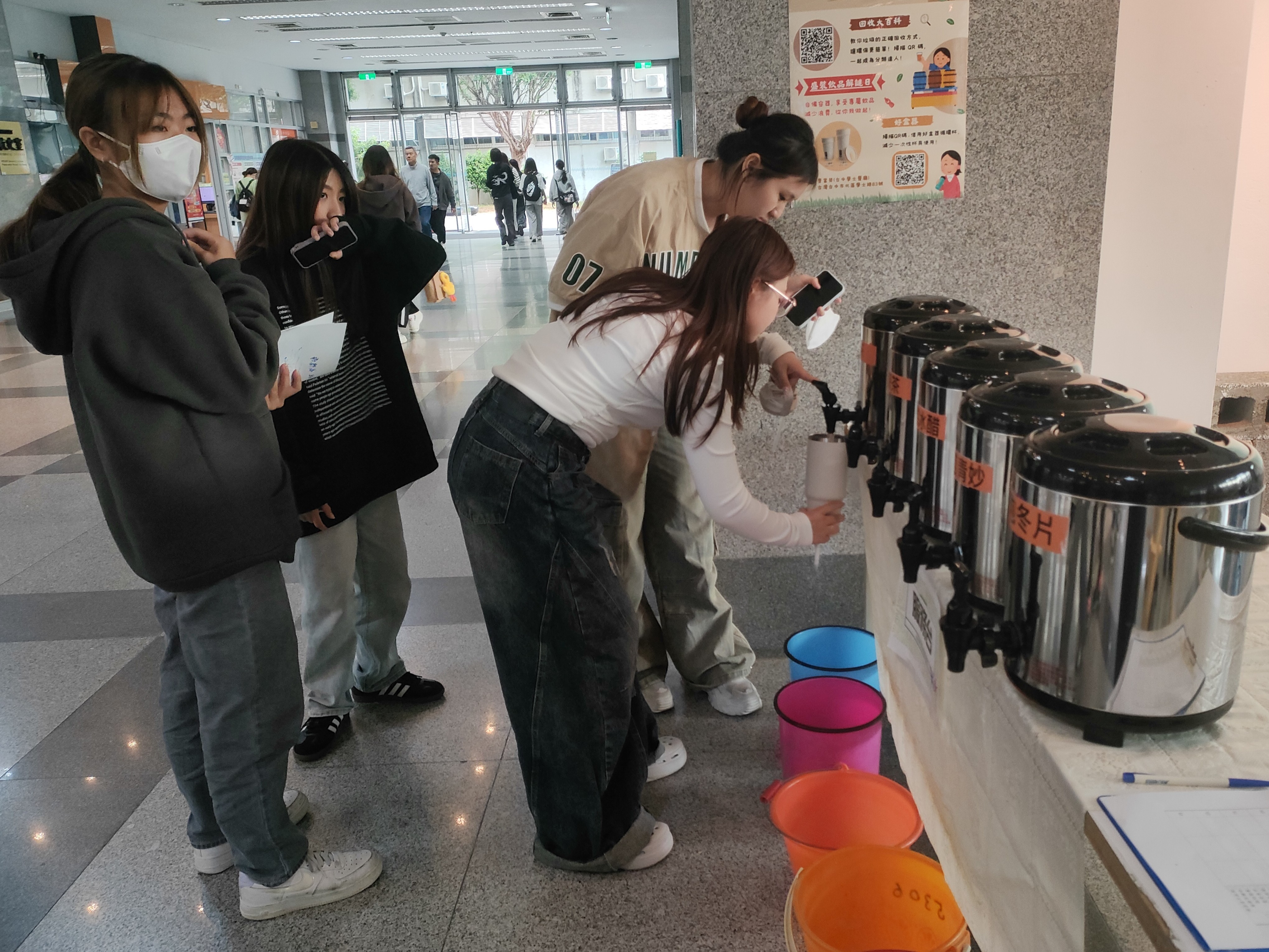 當天活動並結合教育部補助「114年生命教育校園文化推廣與深耕計畫-蔬福生活總動員」,辦理「盛裝飲品解謎日」活動,宣導自備環保容器可盛裝無糖/低糖茶飲,鼓勵全校教職員生使用環保器具的觀念與習慣,並製作環保海報宣導及回收小遊戲互動,建立環保惜福的多元生命教育、服務學習概念。當日活動參加人數計85人。